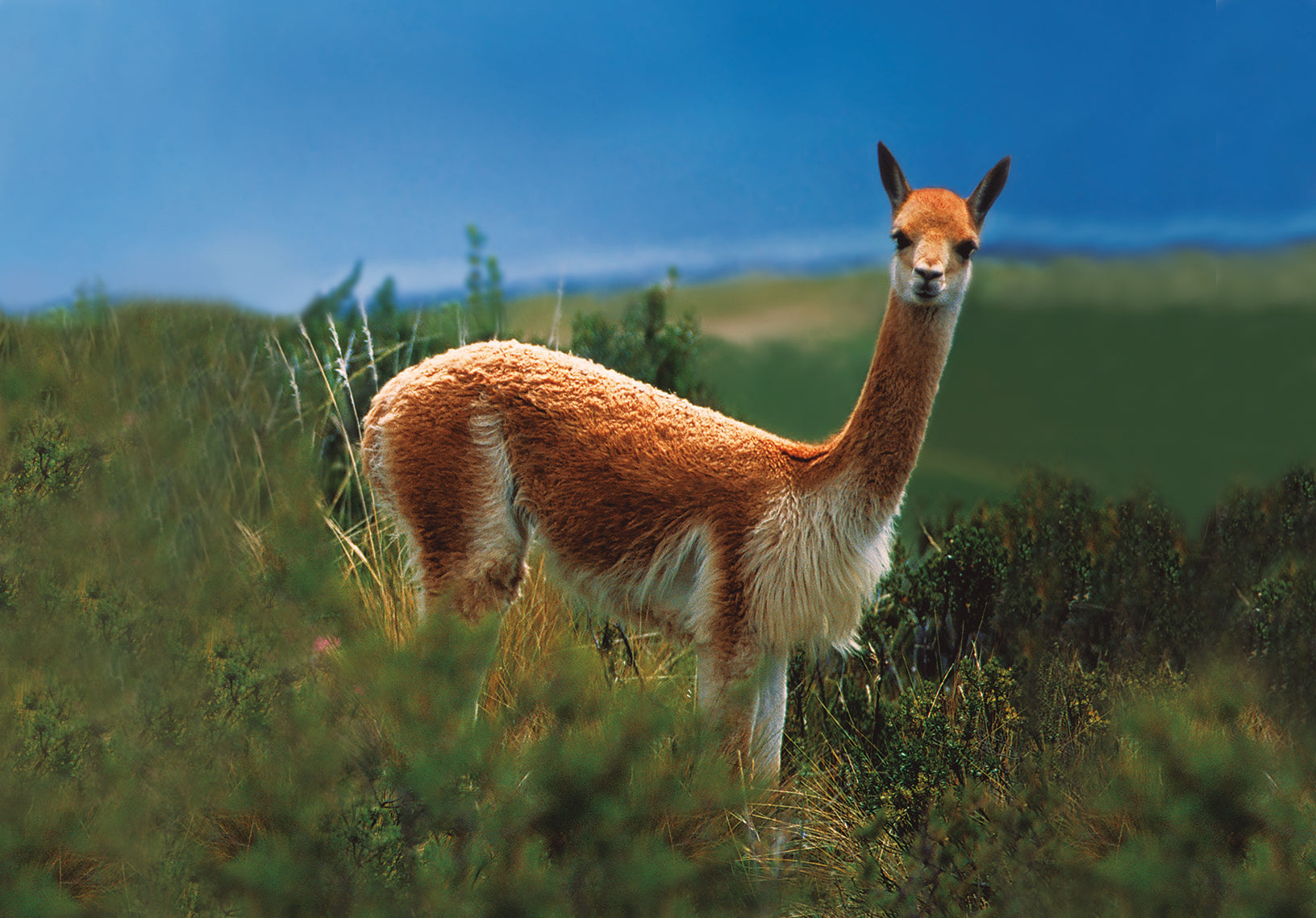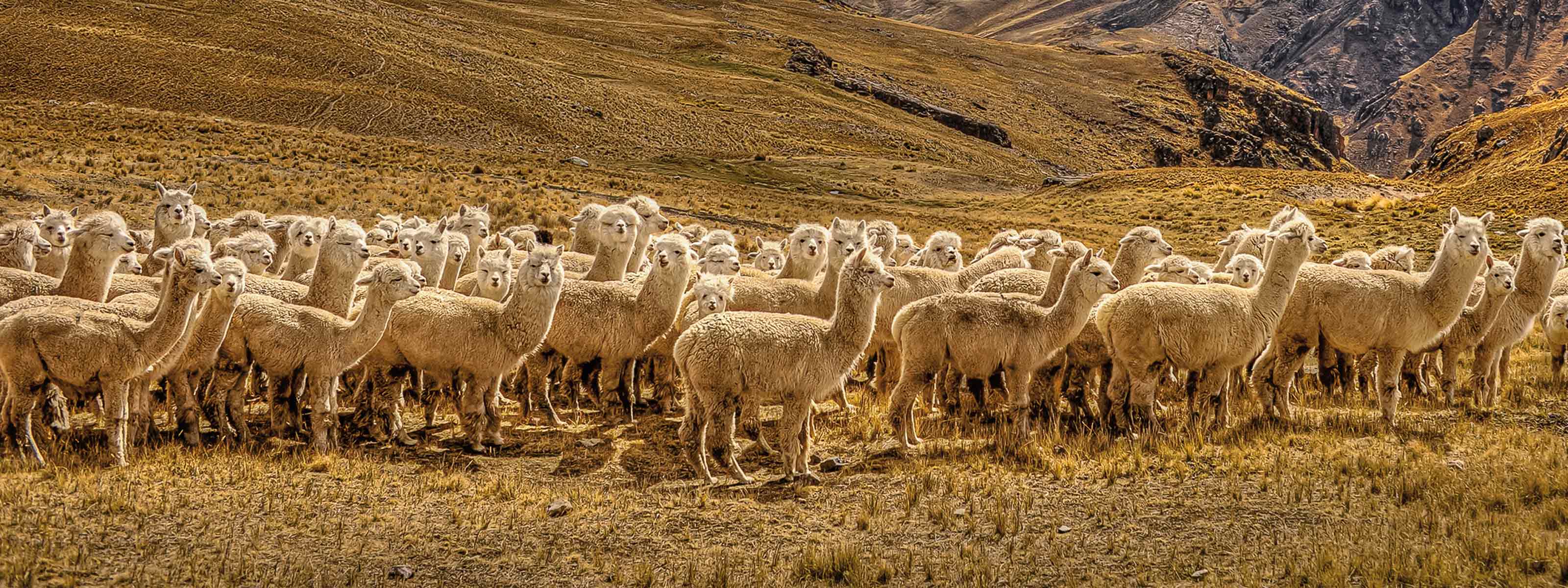 Con una presencia delicada y estilizada, la Vicuña se destaca como el camélido sudamericano de menor tamaño. Su sutil figura alcanza hasta 90 cm de altura al hombro y un peso cercano a los 50 kg. A pesar de haber rozado la extinción en la década de los 60, los esfuerzos conservacionistas en Perú han asegurado su supervivencia. Portadoras de un espléndido manto de pelaje largo, suave y luminoso, las Vicuñas brindan anualmente un vellón que puede pesar cerca de 250 gramos, siendo reconocido este pelo por su exquisita fineza, catalogado como una de las fibras animales más finas del mundo.