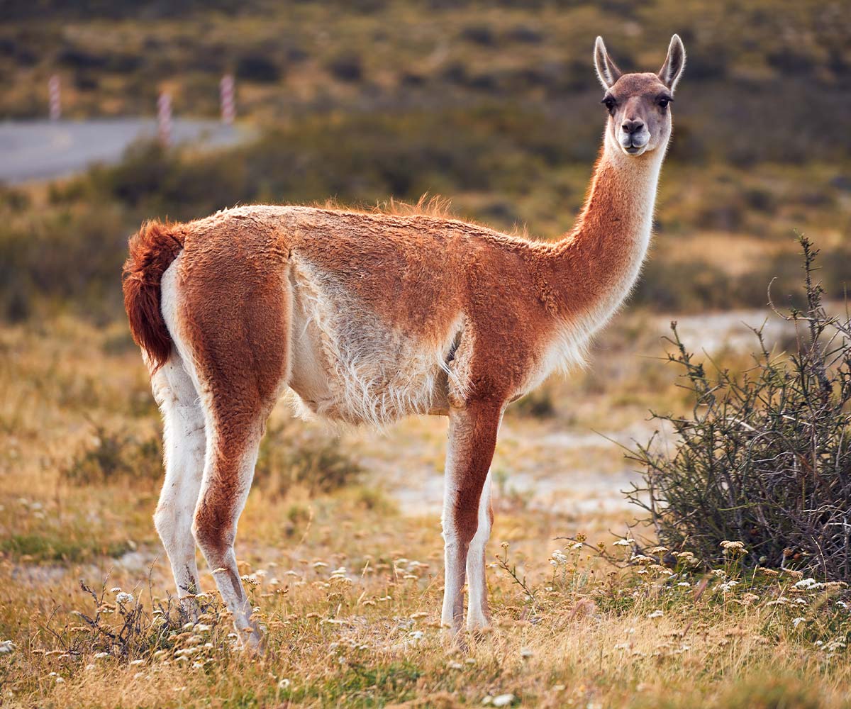 El Guanaco, pariente cercano de la Vicuña, es una especie de camélido salvaje que se agrupa en pequeñas comunidades, comúnmente bajo la supervisión de un solo macho dominante. Su naturaleza resiliente le permite habitar una diversidad de paisajes, desde las costas marítimas hasta las impresionantes altitudes de los Andes, superando los 4,600 metros sobre el nivel del mar. Esta adaptabilidad manifiesta su versatilidad como la más flexible entre los camélidos sudamericanos. La calidad superior de su fibra no sólo se siente al tacto, sino que también refleja la dignidad intrínseca de este majestuoso animal.