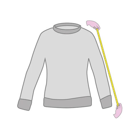 Mide la longitud total de la manga, desde la costura del hombro hasta el lugar deseado para los puños, siguiendo una línea recta (como se muestra en la imagen).